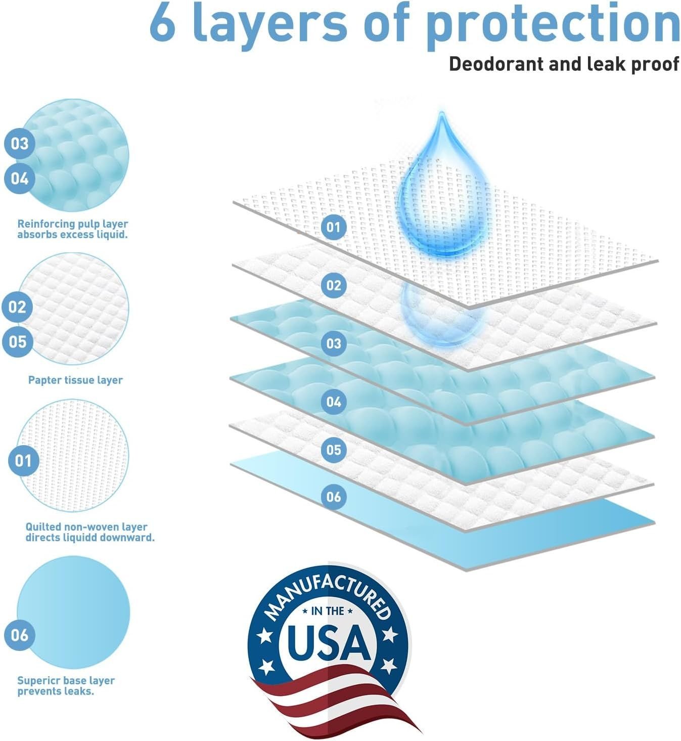 • Multi-Layered Protection: Constructed with multiple layers for maximum efficiency, including a quick-drying top layer, highly absorbent core, and waterproof backing.