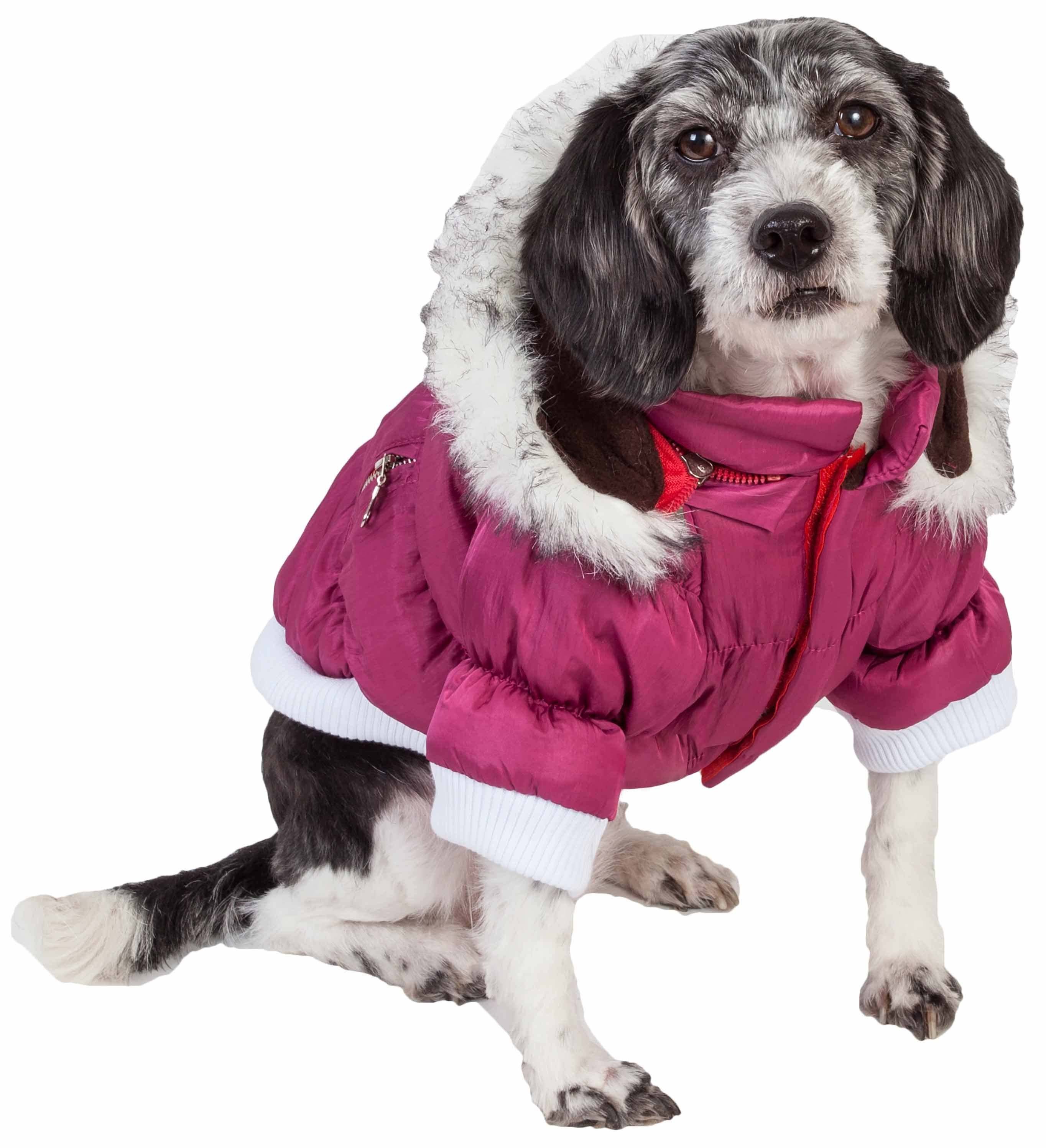 The Pet Life Metallic Parka Dog Coat contains Thinsulate thermal heat retention technology as an inner shell specially inserted between the fabric. This pet coat features matching tone-on-tone inner fleece fabrics, a faux fur removable zip-off hood, a leash slit, and belly-velcro closures for easier on and off access. This coat will keep your pet warmer during those harsher cold weather condition. Available in multiple sizes and colors.